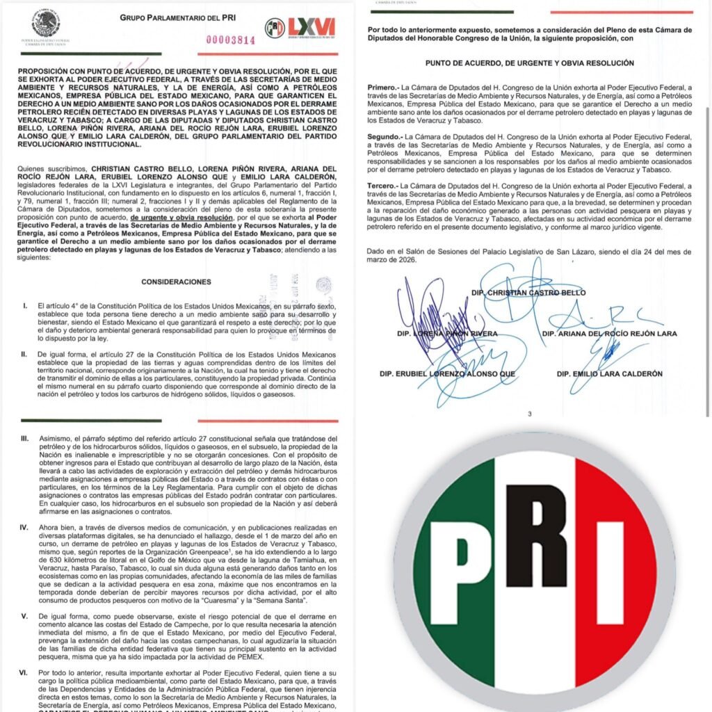 El Grupo Parlamentario del PRI presentó un punto de acuerdo de urgente resolución en la Cámara de Diputados para exhortar a las autoridades federales a atender el derrame de hidrocarburos registrado en las costas de Tabasco y Veracruz. La iniciativa busca frenar el avance del crudo, el cual amenaza con extenderse hacia la Sonda de Campeche, poniendo en riesgo el equilibrio ecológico de la región.